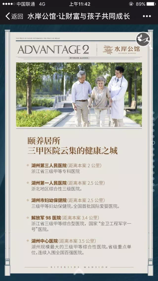 在医疗方面,项目周边全是三甲医院环绕,有人民医院、中心医院(在建中)、中医院、第三人民医院和湖州较好的解放军九八医院。我们这里不仅是湖州配套最醇熟的地方,也是市中心环境较好的区域,在我们项目西边是余家漾公园,东边就是湖州市儿童乐园。
