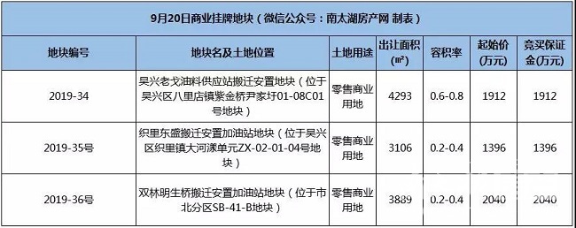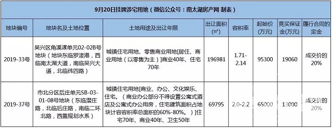 2019-33号:吴兴区角溪漾单元02-02B号地块,用地性质为城镇住宅、零售商业用地,出让面积196981㎡,容积率1.71-2.14,起拍价9.53亿元,起拍楼面价2261元/㎡,将于10月18日开始拍卖。