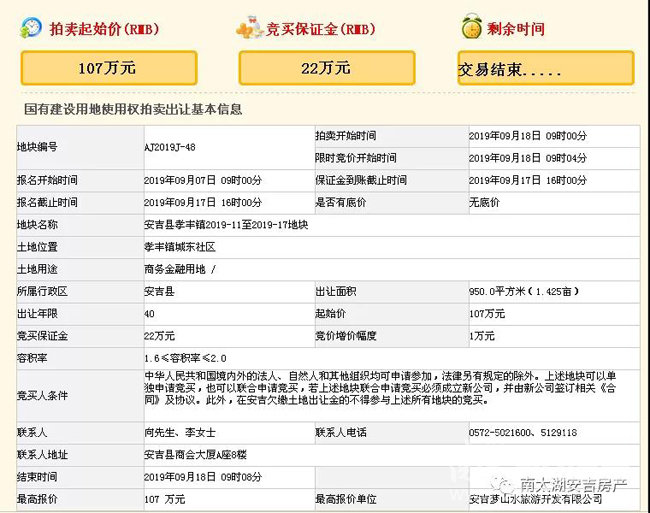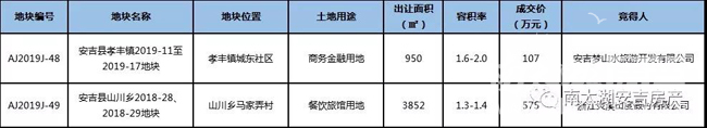 AJ2019J-48:安吉县孝丰镇2019-11至2019-17地块,由安吉梦山水旅游开发有限公司竞得,用地性质为商务金融用地,出让面积950㎡,容积率1.6-2.0,成交价107万元,成交楼面价约563.15元/㎡。